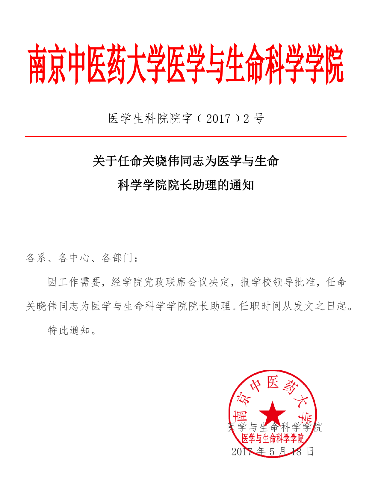 关于任命关晓伟同志为医学与生命科学公司经理助理的通知