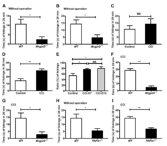 MrgprD (Mas-related G-protein-coupled receptor D)在背根神经节(Dorsal Root Ganglia, DRG)的小直径伤害性感受神经元特异表达,参与痛觉调节。研究人员采用行为学和生理学等实验技术手段,研究了MrgprD在CCI(chronic constriction injury)所致神经病理性疼痛的作用,并首次发现:(1)MrgprD和神经病理性疼痛的机械痛觉过敏和冷痛觉异常的发生相关,对于热痛觉异常则不相关;(2)TRPA1是MrgprD下游的离子通道,β-丙氨酸诱导的钙信号主要通过TRPA1进入细胞;(3)蛋白激酶A(PKA)是β-丙氨酸激活的MrgprD信号的下游通路;(4)CCI模型中β-丙氨酸诱导的疼痛行为明显增加,而瘙痒行为无变化,敲除TRAP1也减轻了β-丙氨酸诱导的CCI模型疼痛行为。
