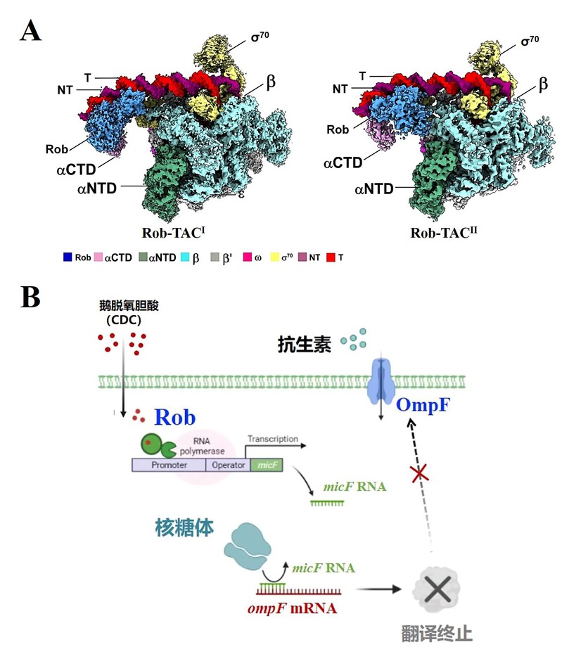 通过采用单颗粒冷冻电镜技术(Single particle Cryo-EM),公司林炜教授团队克服了研究瓶颈问题,最终解析了含大肠杆菌RNA聚合酶、耐药调控基因启动子micF与大肠杆菌Rob蛋白的转录激活复合物Rob-TAC的电镜结构,成功捕获了Rob单体的转录激活状态(图1)。研究证明 Rob与 RNA聚合酶的C末端结构域、σ70R4结构域同时发生相互作用,阐明了此类作用力在细菌转录激活调控中的重要意义。除阻碍RNA聚合酶σ70R4结构域结合启动子的-35元件外,酸性环(acidic loop)可辅助稳定Rob NTD与保守rob结合元件间的特异性相互作用。另外,配体对接和生化实验分析表明,Rob CTD与普遍存在的Gyrl样结构域具有高度结构相似性,可通过识别结合配体发生“别构调节”功能,进而促进Rob-TAC的形成。该研究阐明了Rob介导的多种关键蛋白-蛋白、蛋白-DNA相互作用,回答了Rob如何通过“招募”和“别构调节”机制促进耐药调控基因转录,进而拮抗外膜转运蛋白OmpF翻译,增强细菌抗生素耐药的关键科学问题,同时也揭示了其在AraC家族蛋白中的普遍调控意义,可为新型抗耐药菌感染药物的研发提供新的靶点和研究思路。