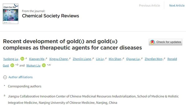 近日,太阳集团tyc4633•整合医学公司刘武昆课题组在化学一级学科顶级期刊Chemical Society Reviews (IF:54.564)上在线发表了综述论文“Recent development of gold(I) and gold(III) complexes as therapeutic agents for cancer diseases”。