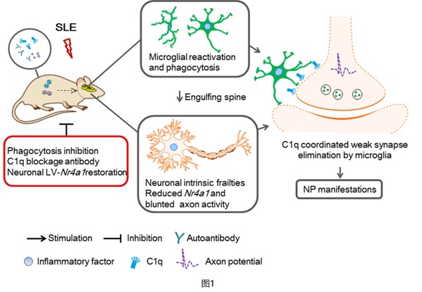系统性红斑狼疮(SLE)是一种难以治愈的自身免疫性疾病,40-90%的SLE患者会出现神经精神症状,称为神经精神狼疮(NPSLE)。NPSEL早期发病机制仍不明确,是临床治疗学突破的瓶颈。补体蛋白C1q是经典补体信号的启动因子。最近研究发现脑内C1q具有独特的生物学功能,可以调控小胶质细胞对神经突触的修剪,对神经环路的精准发育及衰老、阿尔茨海默病、精神分裂症等病变过程中的突触丢失至关重要。但对于其在NPSLE中的效应,仍然知之甚少。