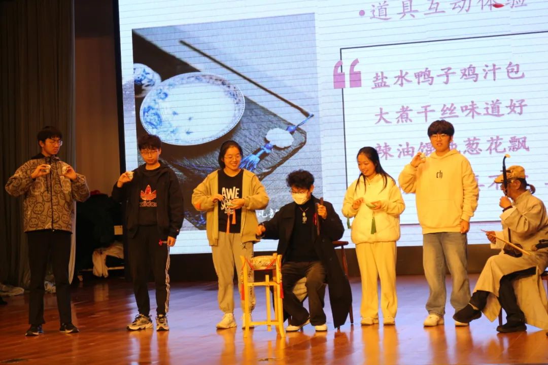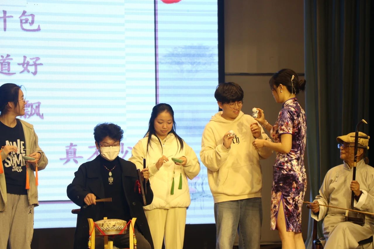 本次活动独具匠心地设置了道具互动环节。在刘璇老师的邀请下,台下的同学们踊跃举手报名,上台体验了酒杯、碟子、筷子和板鼓等独特的伴奏乐器。在老师的教授和配合下,平日常见的器皿在6位同学的手中奏出了不平凡的声音。台下其他的观众们也纷纷跟唱小段,大家共同演唱出了南京白局的南中医风味。