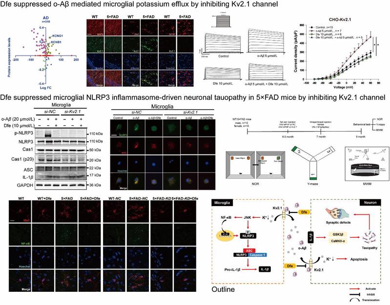 在本研究论文中,研究人员发现Aβ寡聚体能够通过选择性激活Kv2.1通道诱导小胶质细胞钾外流从而激活JNK/NF-κB通路,并促进NLRP3炎症小体的启动和组装过程。进一步地,研究者以实验室前期从“老药库”中发现的Kv2.1抑制剂Dfe为探针探究了Kv2.1在AD病理中的调控机制。Dfe能够通过抑制Kv2.1通道有效拮抗Aβ寡聚体诱导的小胶质细胞NLRP3炎症小体激活和神经元Tau过度磷酸化,并最终改善AD转基因鼠的病理表型。研究阐述了Aβ介导的NLRP3炎症小体激活的潜在机制,并强调了Kv2.1抑制剂在阻断Aβ-Tau级联反应和治疗AD方面的潜力,为AD的病理机制研究以及基于Dfe的抗AD药物研发提供了重要的科学依据。