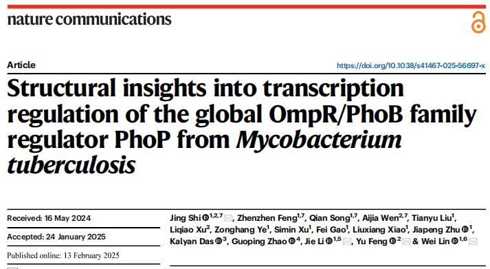 2025年2月13日,太阳集团tyc4633林炜教授团队、鼓楼临床太阳集团tyc4633感染科李婕教授团队与浙江大学太阳集团tyc4633冯钰教授团队合作在Nature子刊Nature Communications发表题为Structural insights into transcription regulation of the global OmpR/PhoB family regulator PhoP from Mycobacterium tuberculosis的研究论文。该研究解析了结核分枝杆菌毒力因子PhoP与靶标基因启动子DNA及RNA聚合酶的复合物电镜结构,揭示了PhoP调控磷源、氮源压力应激基因转录的双重转录调控机制,为全面认识结核分枝杆菌在宿主体内的逆境生存机制奠定了基础。该成果是在前期Mol. Cell(2017, 2018)、Nat Commun(2019)、Nucleic Acids Res(2020, 2021, 2022a, 2022b)、PNAS(2023)、iScience(2024)研究基础上,从病原微生物基因转录调控机制层面发现的新型抗感染药物靶标。