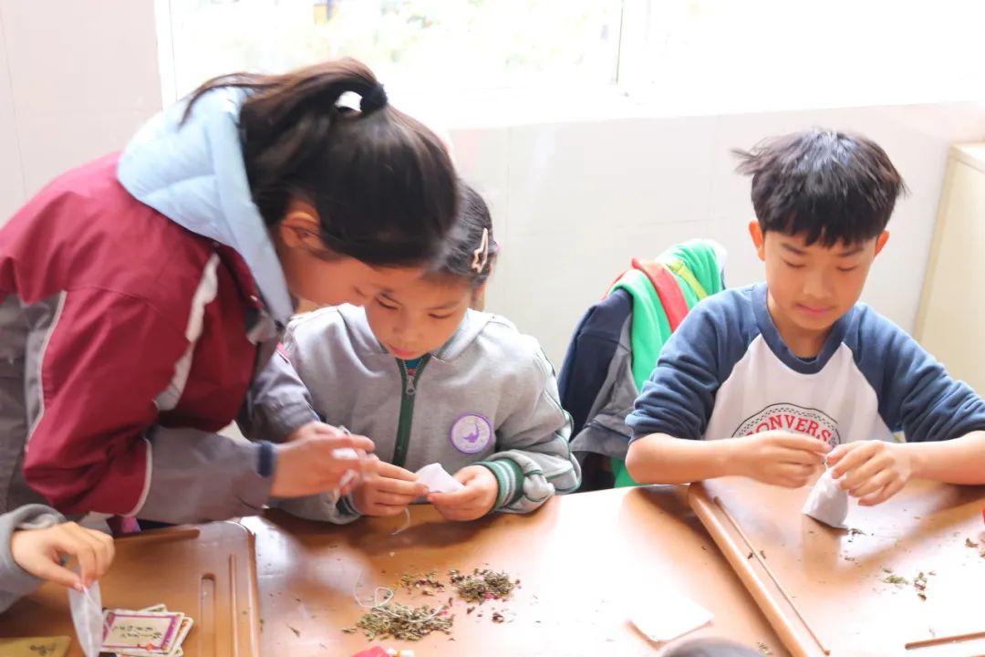 在实践体验环节,志愿者指导同学们制作传统香囊和中药贴画。小朋友们认真挑选香料,品味芬芳,仔细将中草药装进香囊袋,也种进自己的心田。在他们手中,枸杞、薰衣草等中药材化身"天然色彩",组合成一幅幅展现中医药特色的图画。